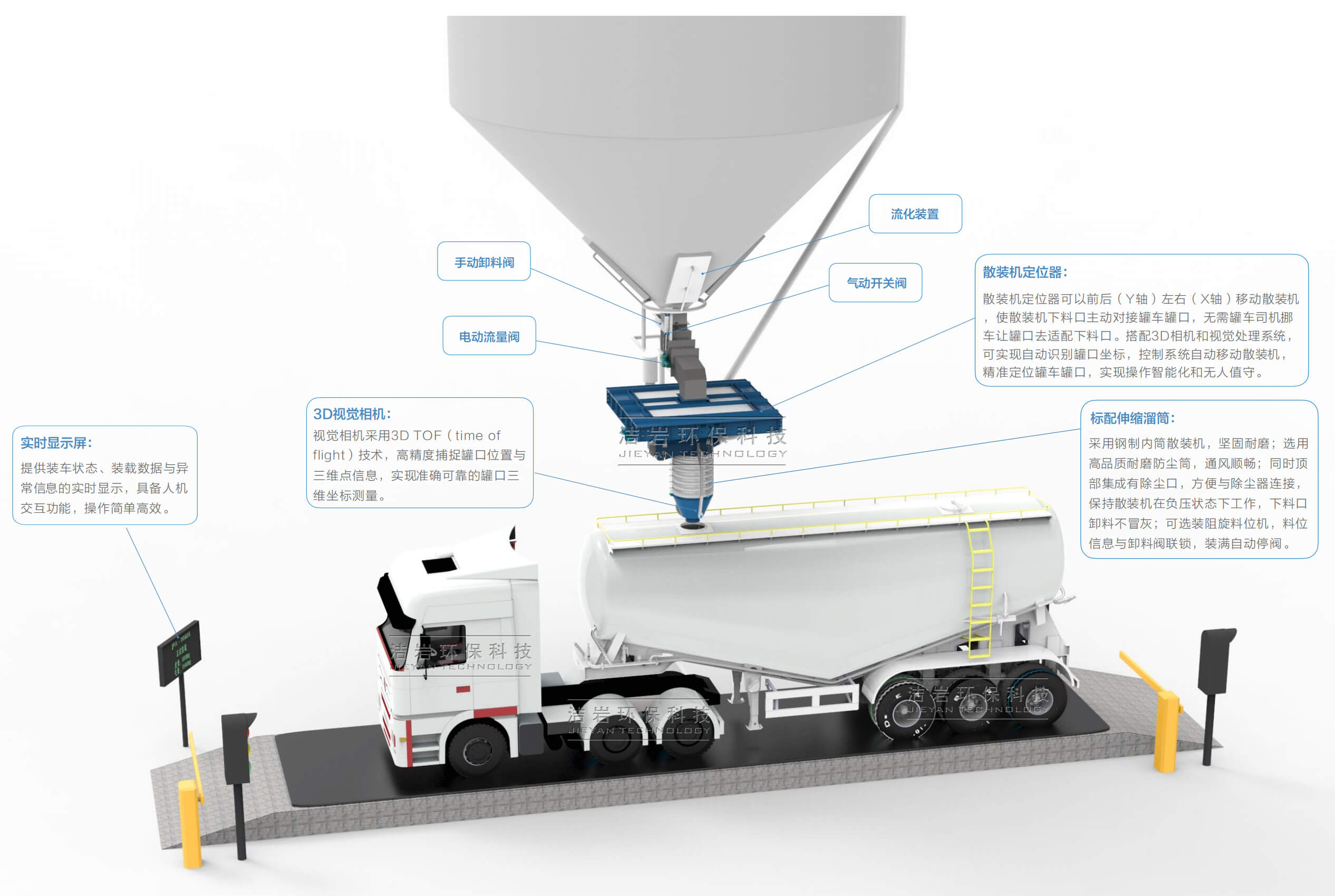 免移車裝車系統(tǒng)可配置智能感知設(shè)備(激光雷達(dá)、攝像頭等),實(shí)時(shí)獲取車輛與散裝機(jī)接口的相對(duì)位置,自動(dòng)完成精準(zhǔn)定位,顯著減少人工操作時(shí)間,加速散裝作業(yè)流程,大幅提升裝車效率。
