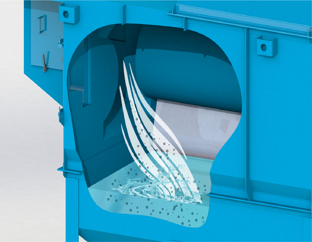 經(jīng)過離心分離室離心處理的空氣進(jìn)入到洗滌室,此時空氣中的絕大部分粉塵顆粒都已經(jīng)被處理掉。洗滌室有一個精心設(shè)計的漩渦狀風(fēng)道,空氣進(jìn)入漩渦狀通道后,運(yùn)動方向會產(chǎn)生劇烈改變,從而在液面上激起無數(shù)的水花和霧滴,極少量未處理掉的粉塵顆粒,在通過這些水花和霧滴時,又進(jìn)一步被洗滌和吸附,含塵空氣被凈化干凈。凈化干凈的空氣由此從除塵工藝轉(zhuǎn)向脫水工藝。