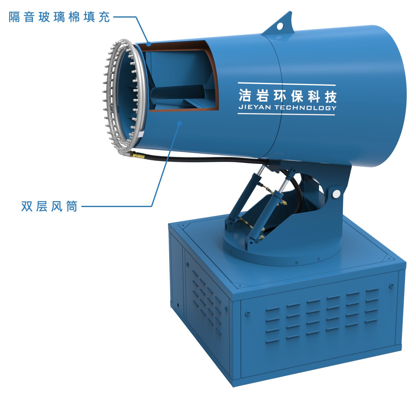 智能超細遠程射霧器是根據(jù)風送原理,先使用先進的高壓泵、超細霧化噴嘴將水霧化,將常態(tài)溶液霧化成0~30μm的細小霧粒。在風機的作用下,將霧定向拋射到指定位置,在塵埃處及其上方或者周圍進行噴霧覆蓋。粉塵顆粒與水霧充分的融合,逐漸凝結(jié)成顆粒團,在自身的重力作用下快速沉降到地面,從而達到降塵的目的。